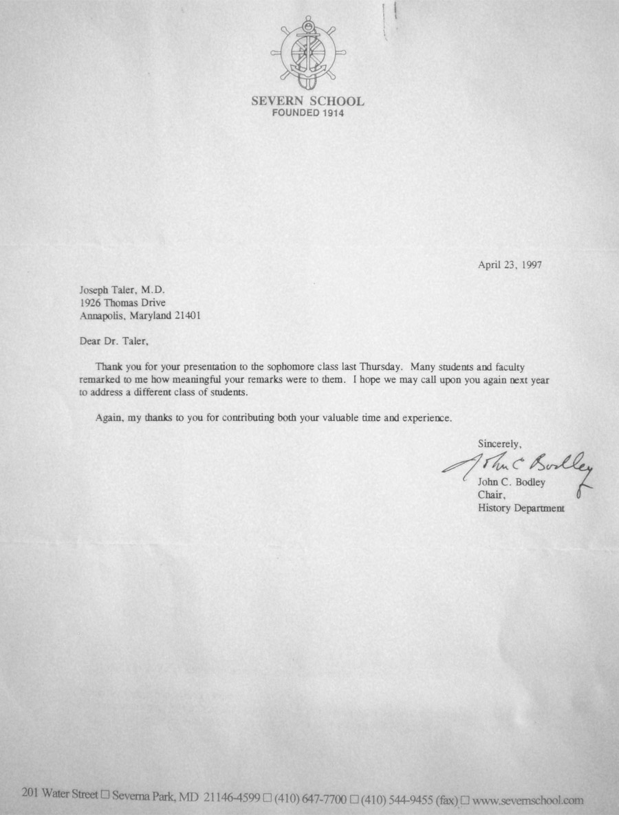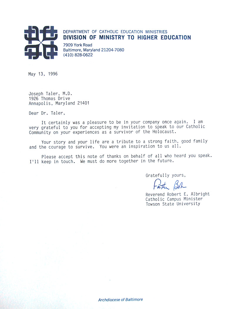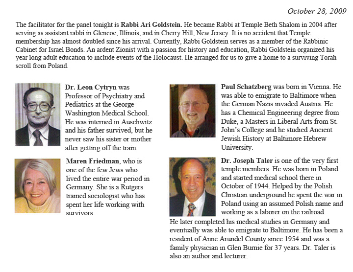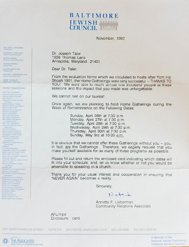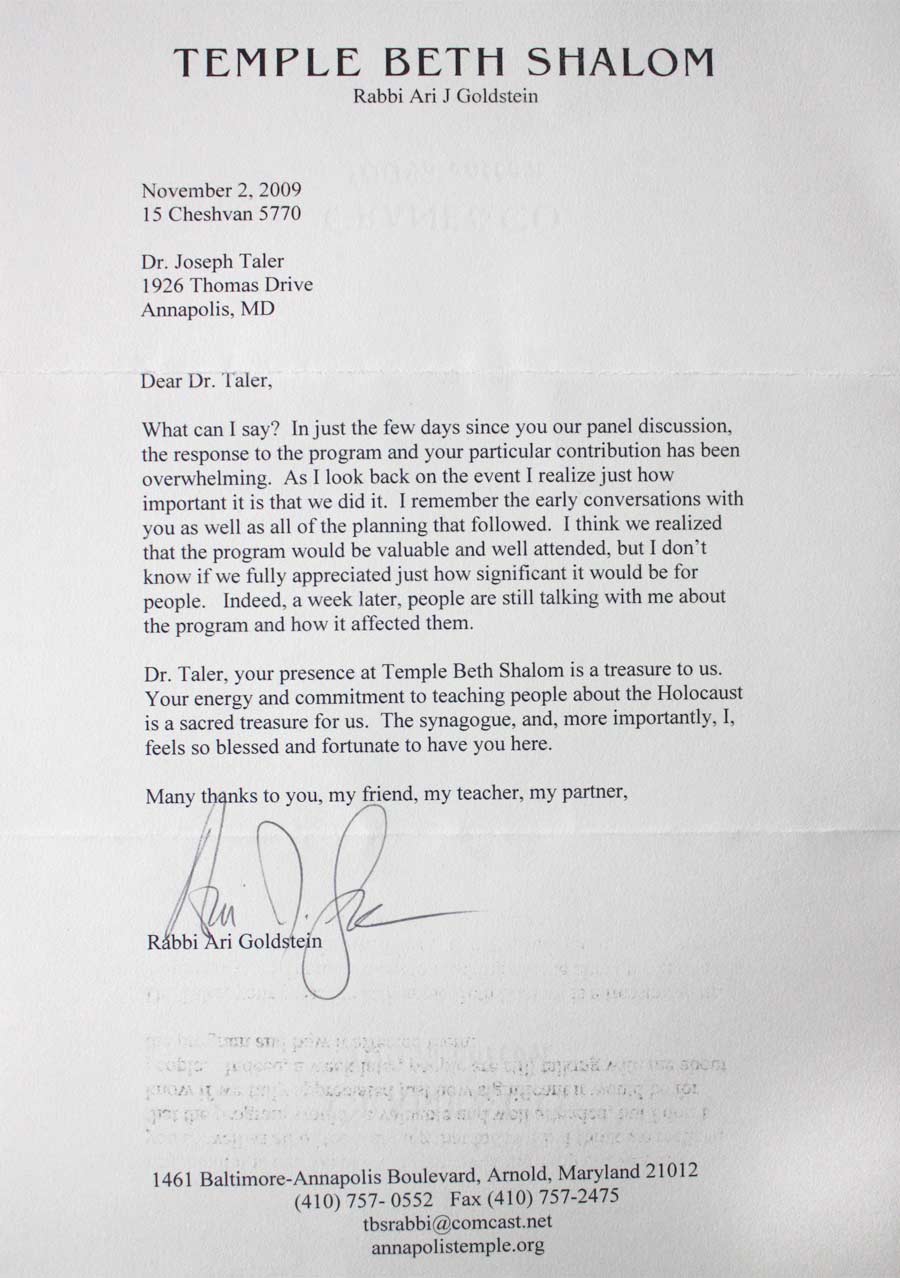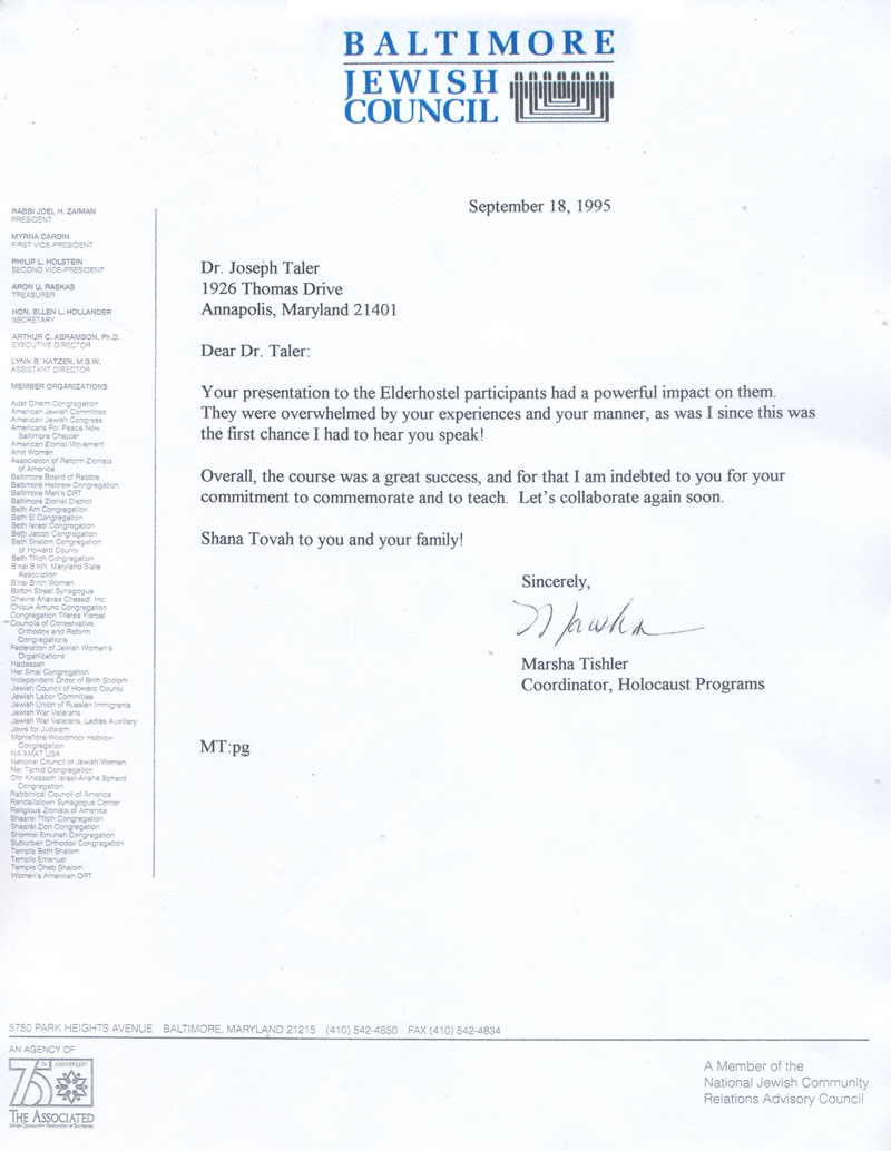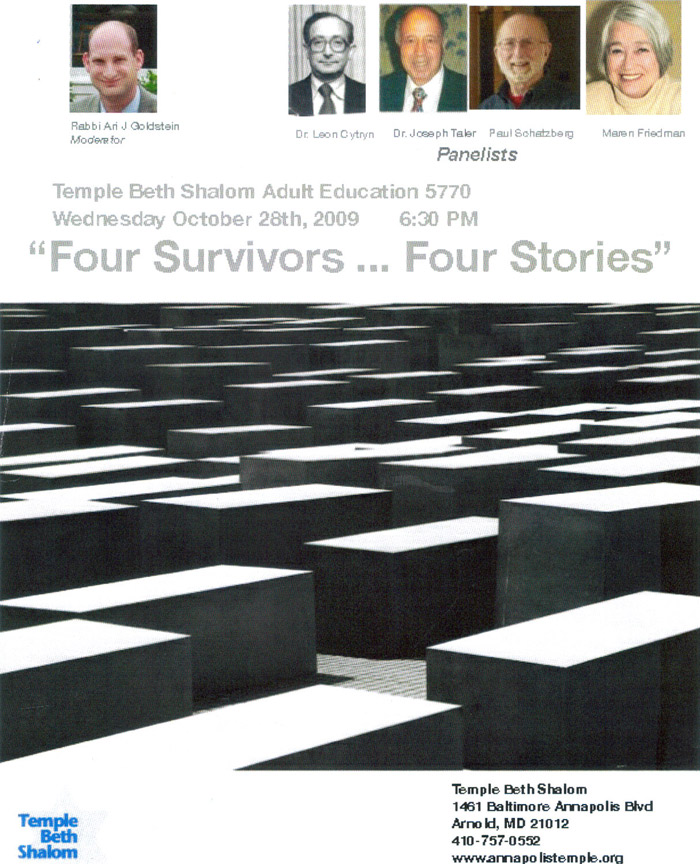 ![]() Four Survivors ... Four Stories Panel Discussion at Temple Beth Shalom October 28, 2009 Early in 2009 Rabbi Ari Goldstein asked me to organize an educational event commemorating the Holocaust. We decided to put it into a broader historical context and to use a prospective panel format. I knew three panelists of different backgrounds and different war experiences. Four of us would respond spontaneously to questions put by Rabbi Goldstein and the members of the audience which included students and people of various occupations and religious interests. About 300 people attended. Arrangements were made by Karen Brachmen, Administrator and Doreen Noel, Office Coordinator. Those who attended expressed many, many thanks for this extraordinary experience. ![]() Rabbi Goldstein's Column click image to enlarge ![]() Rabbi Goldstein's Letter click image to enlarge ![]() click image to enlarge Yom Ha'Shoah Programs in Churches, 1993 ![]() click image to enlarge Thank You Letter Reverend Robert E. Albright Division of Catholic Education Ministries ![]() click image to enlarge Thank you letter John C. Bodly History Deptartment Chair, Severn School ![]() click image to enlarge Thank you letter Janice Jobson The Teacher of Introduction to Human Beliefs, Severn School. Joseph has worked with her since April of 1997. "I have been teaching these classes every year for thirteen years. Introduction to Human Beliefs deals with aspects of life which for the most part are beyond the middle school curriculum." - Joseph ![]() click image to enlarge Thank you letter Janice Jobson The Teacher of Introduction to Human Beliefs, Severn School. Joseph has worked with her since April of 1997. "I have been teaching these classes every year for thirteen years. Introduction to Human Beliefs deals with aspects of life which for the most part are beyond the middle school curriculum." - Joseph ![]() click image above to enlarge Montgomery County Public Schools Evaluation ![]() click image above to enlarge Supervisor Letter Sandra S. Days ![]() click image to enlarge the 2 letters - click "next" to view second letter 2 letters to Dr. Joseph Taler The United States Holocaust Memorial Museum ![]() click image to enlarge Thaler's and Talers Cindy Fox, Lisa Thaler (Genealogist and Author), Lt. Col. David Fox, Martin Thaler (Lisa’s husband and my third cousin) holding their son Henry Thaler David Fox established a link between Joseph and the Thaler Family. Photo taken by Joseph at Joseph and Bronka’s home in Annapolis, 2000 |