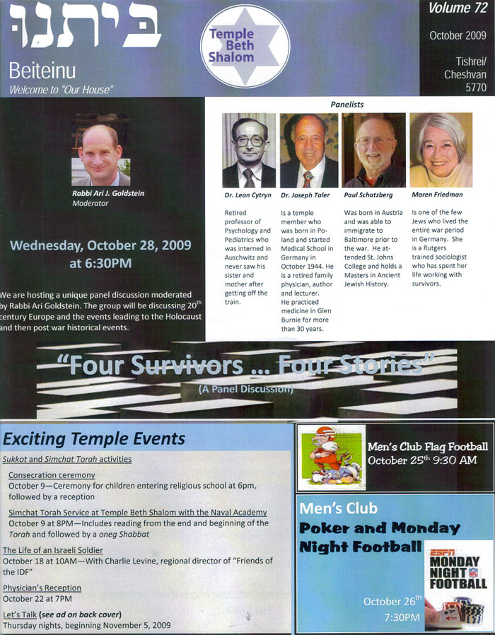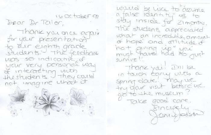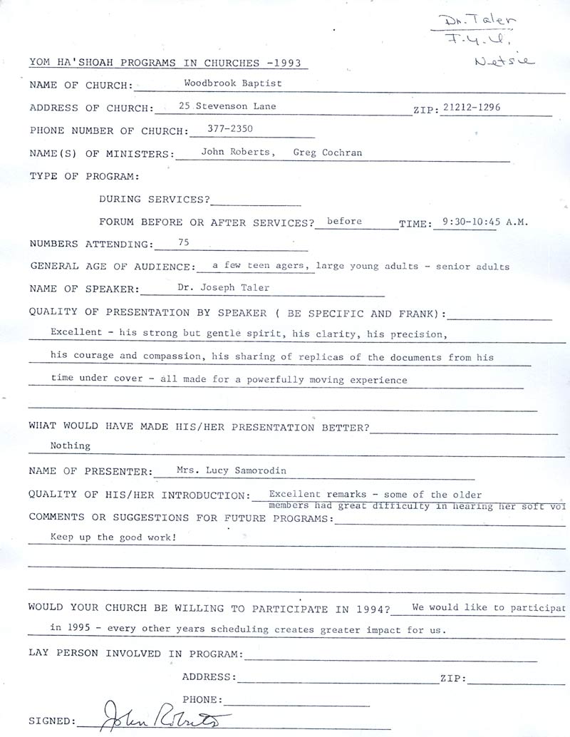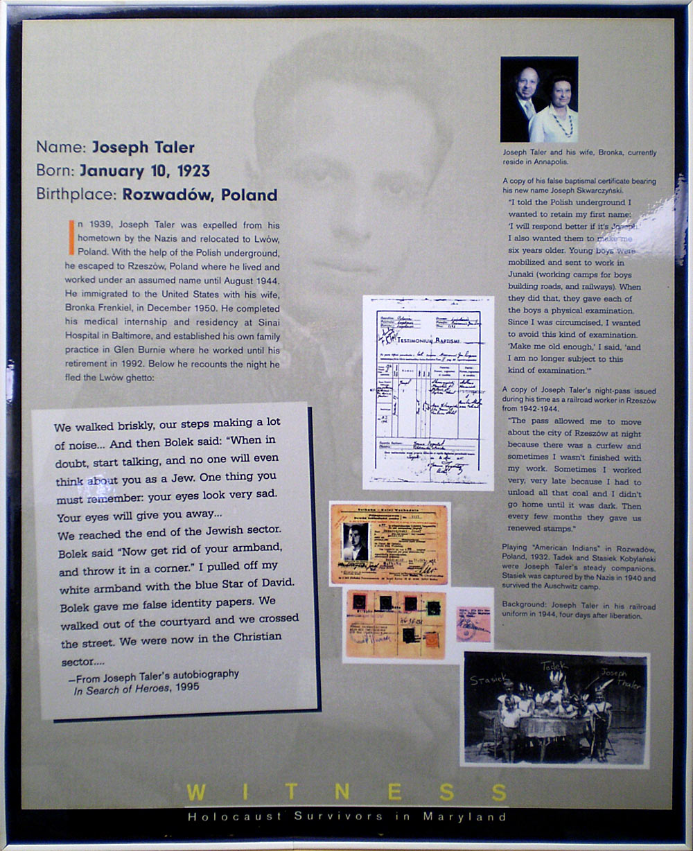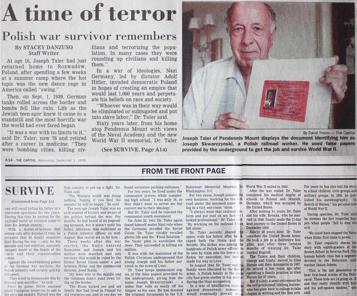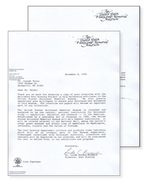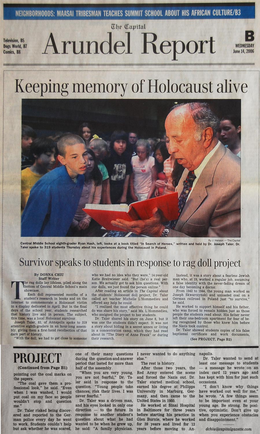 ![]() Four Survivors ... Four Stories Panel Discussion at Temple Beth Shalom October 28, 2009 Early in 2009 Rabbi Ari Goldstein asked me to organize an educational event commemorating the Holocaust. We decided to put it into a broader historical context and to use a prospective panel format. I knew three panelists of different backgrounds and different war experiences. Four of us would respond spontaneously to questions put by Rabbi Goldstein and the members of the audience which included students and people of various occupations and religious interests. About 300 people attended. Arrangements were made by Karen Brachmen, Administrator and Doreen Noel, Office Coordinator. Those who attended expressed many, many thanks for this extraordinary experience. ![]() Rabbi Goldstein's Column click image to enlarge ![]() Rabbi Goldstein's Letter click image to enlarge ![]() click image to enlarge Yom Ha'Shoah Programs in Churches, 1993 ![]() click image to enlarge Thank You Letter Reverend Robert E. Albright Division of Catholic Education Ministries ![]() click image to enlarge Thank you letter John C. Bodly History Deptartment Chair, Severn School ![]() click image to enlarge Thank you letter Janice Jobson The Teacher of Introduction to Human Beliefs, Severn School. Joseph has worked with her since April of 1997. "I have been teaching these classes every year for thirteen years. Introduction to Human Beliefs deals with aspects of life which for the most part are beyond the middle school curriculum." - Joseph ![]() click image to enlarge Thank you letter Janice Jobson The Teacher of Introduction to Human Beliefs, Severn School. Joseph has worked with her since April of 1997. "I have been teaching these classes every year for thirteen years. Introduction to Human Beliefs deals with aspects of life which for the most part are beyond the middle school curriculum." - Joseph ![]() click image above to enlarge Montgomery County Public Schools Evaluation ![]() click image above to enlarge Supervisor Letter Sandra S. Days ![]() click image to enlarge the 2 letters - click "next" to view second letter 2 letters to Dr. Joseph Taler The United States Holocaust Memorial Museum ![]() click image to enlarge Thaler's and Talers Cindy Fox, Lisa Thaler (Genealogist and Author), Lt. Col. David Fox, Martin Thaler (Lisa’s husband and my third cousin) holding their son Henry Thaler David Fox established a link between Joseph and the Thaler Family. Photo taken by Joseph at Joseph and Bronka’s home in Annapolis, 2000 |