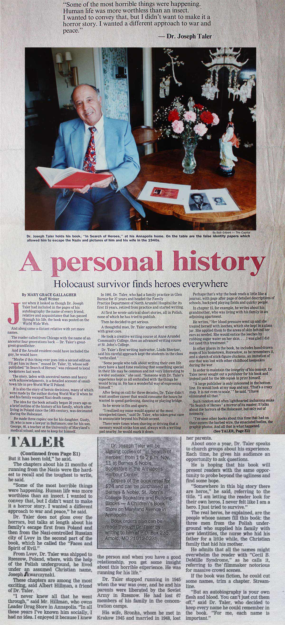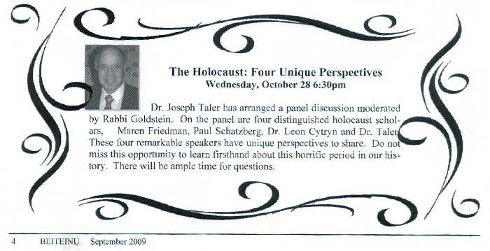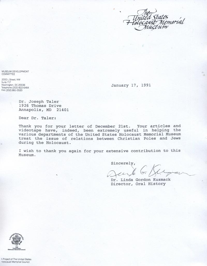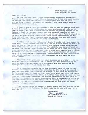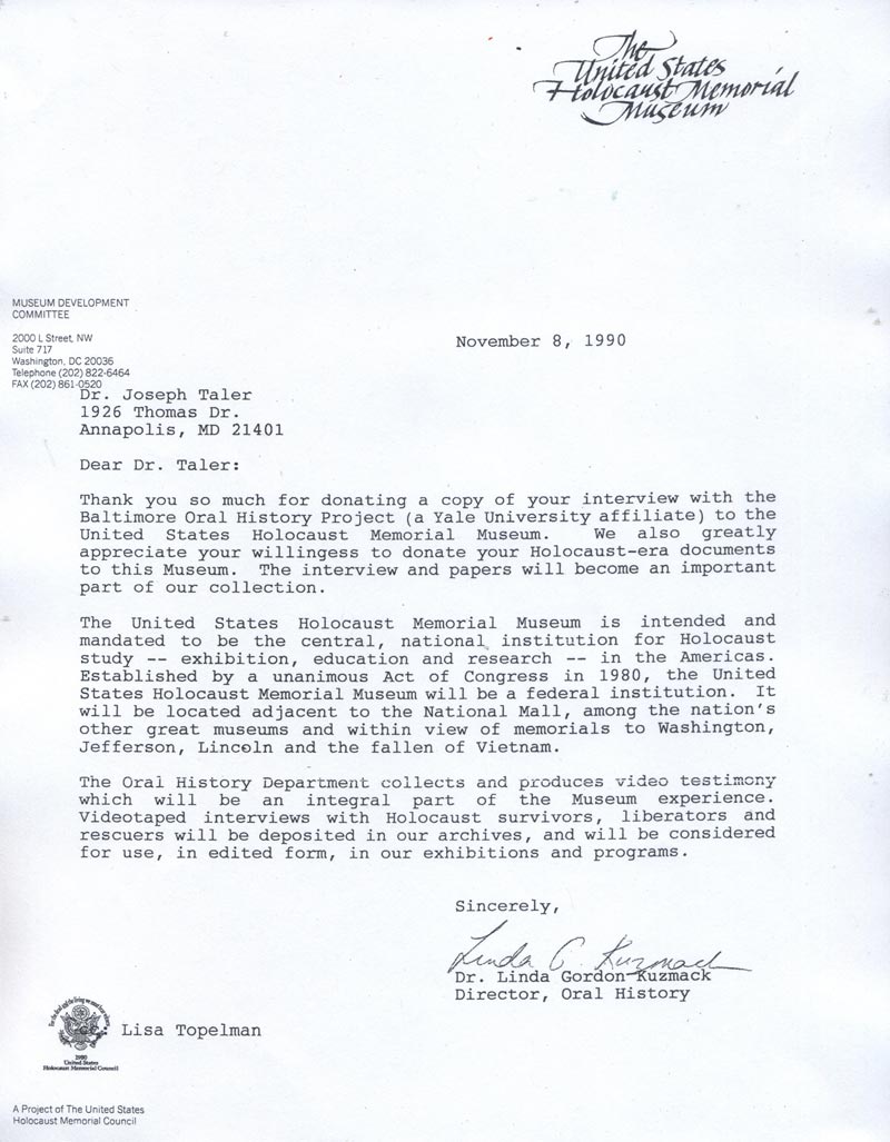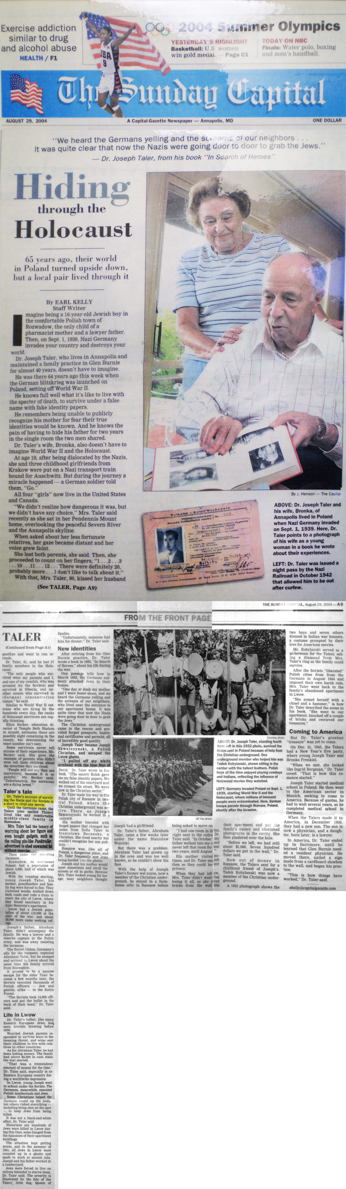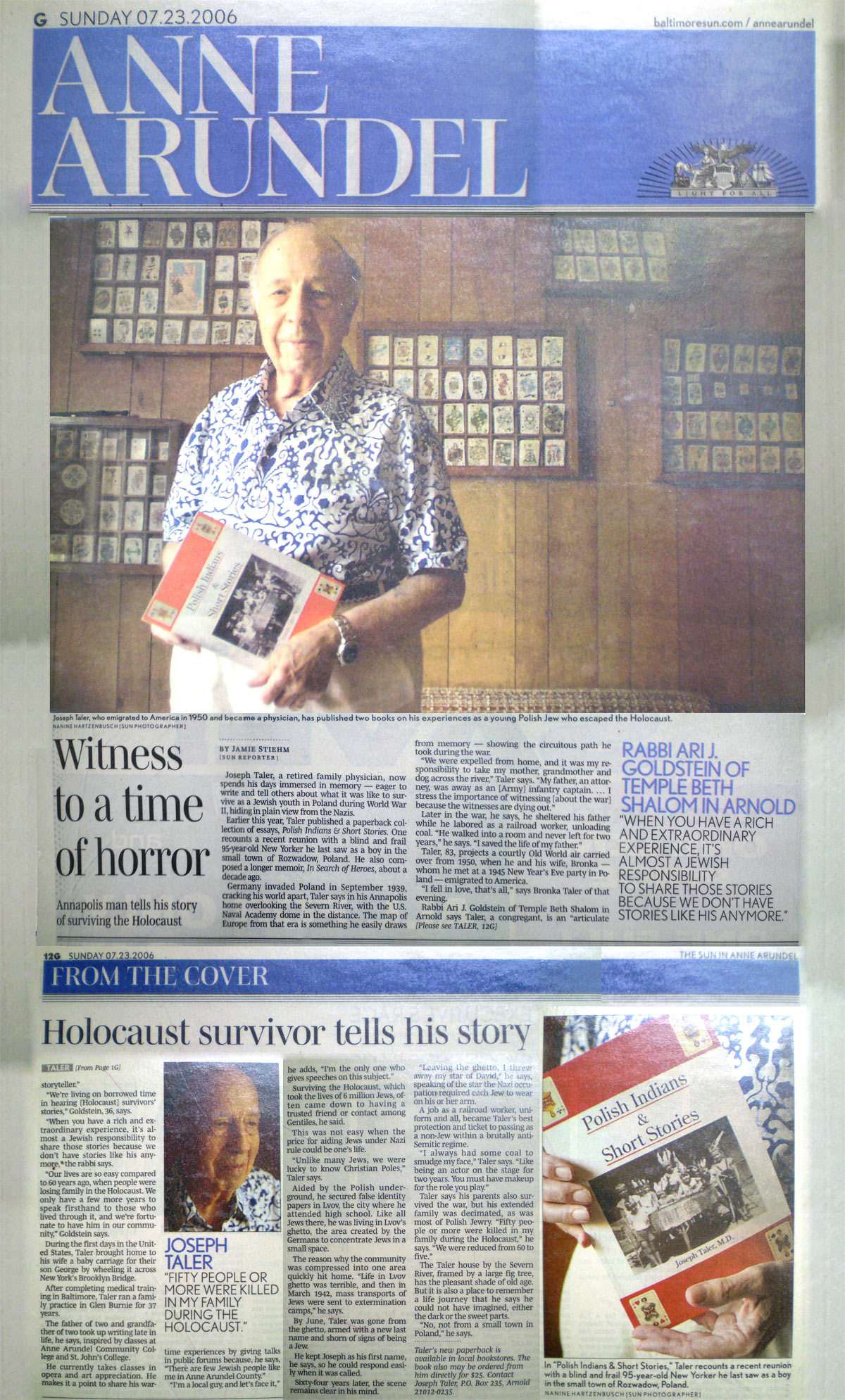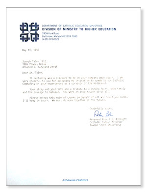 ![]() Four Survivors ... Four Stories Panel Discussion at Temple Beth Shalom October 28, 2009 Early in 2009 Rabbi Ari Goldstein asked me to organize an educational event commemorating the Holocaust. We decided to put it into a broader historical context and to use a prospective panel format. I knew three panelists of different backgrounds and different war experiences. Four of us would respond spontaneously to questions put by Rabbi Goldstein and the members of the audience which included students and people of various occupations and religious interests. About 300 people attended. Arrangements were made by Karen Brachmen, Administrator and Doreen Noel, Office Coordinator. Those who attended expressed many, many thanks for this extraordinary experience. ![]() Rabbi Goldstein's Column click image to enlarge ![]() Rabbi Goldstein's Letter click image to enlarge ![]() click image to enlarge Yom Ha'Shoah Programs in Churches, 1993 ![]() click image to enlarge Thank You Letter Reverend Robert E. Albright Division of Catholic Education Ministries ![]() click image to enlarge Thank you letter John C. Bodly History Deptartment Chair, Severn School ![]() click image to enlarge Thank you letter Janice Jobson The Teacher of Introduction to Human Beliefs, Severn School. Joseph has worked with her since April of 1997. "I have been teaching these classes every year for thirteen years. Introduction to Human Beliefs deals with aspects of life which for the most part are beyond the middle school curriculum." - Joseph ![]() click image to enlarge Thank you letter Janice Jobson The Teacher of Introduction to Human Beliefs, Severn School. Joseph has worked with her since April of 1997. "I have been teaching these classes every year for thirteen years. Introduction to Human Beliefs deals with aspects of life which for the most part are beyond the middle school curriculum." - Joseph ![]() click image above to enlarge Montgomery County Public Schools Evaluation ![]() click image above to enlarge Supervisor Letter Sandra S. Days ![]() click image to enlarge the 2 letters - click "next" to view second letter 2 letters to Dr. Joseph Taler The United States Holocaust Memorial Museum ![]() click image to enlarge Thaler's and Talers Cindy Fox, Lisa Thaler (Genealogist and Author), Lt. Col. David Fox, Martin Thaler (Lisa’s husband and my third cousin) holding their son Henry Thaler David Fox established a link between Joseph and the Thaler Family. Photo taken by Joseph at Joseph and Bronka’s home in Annapolis, 2000 |