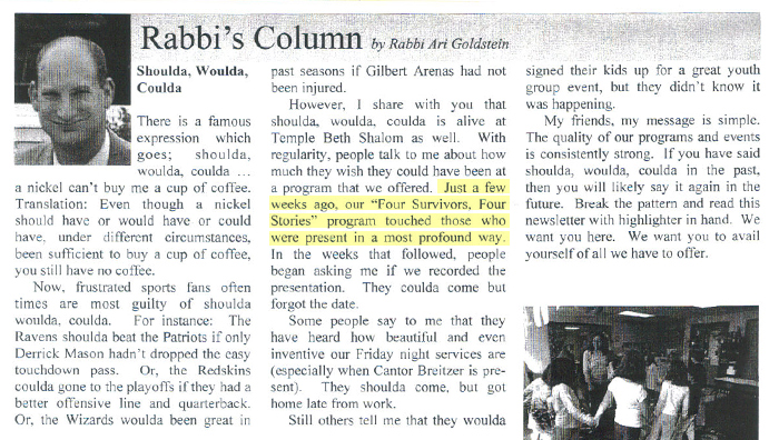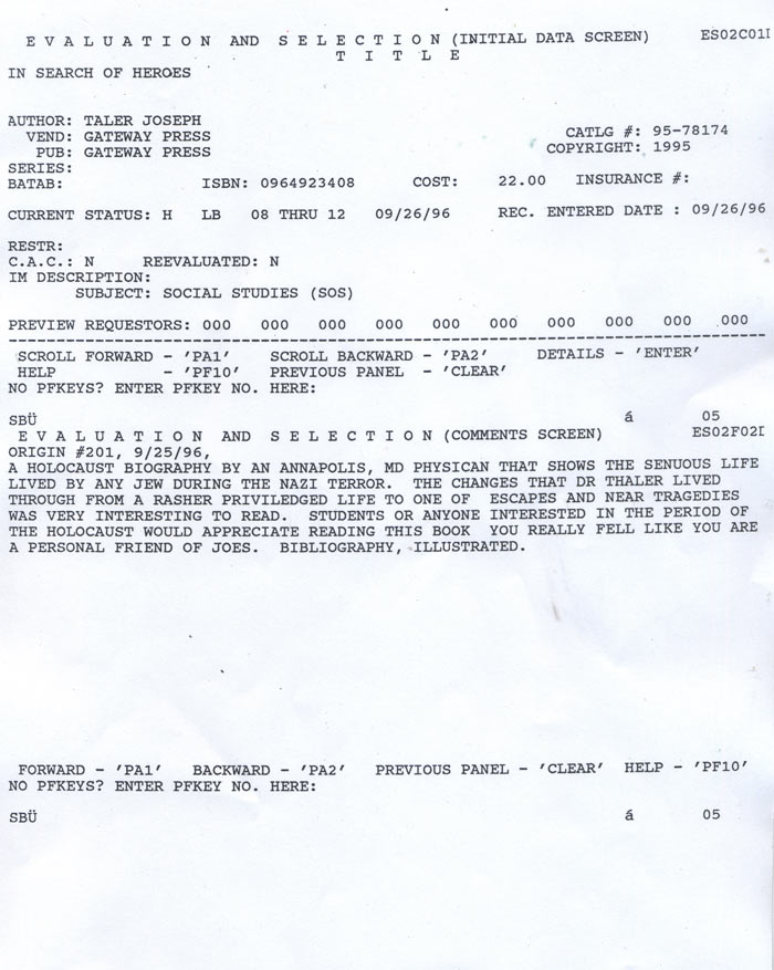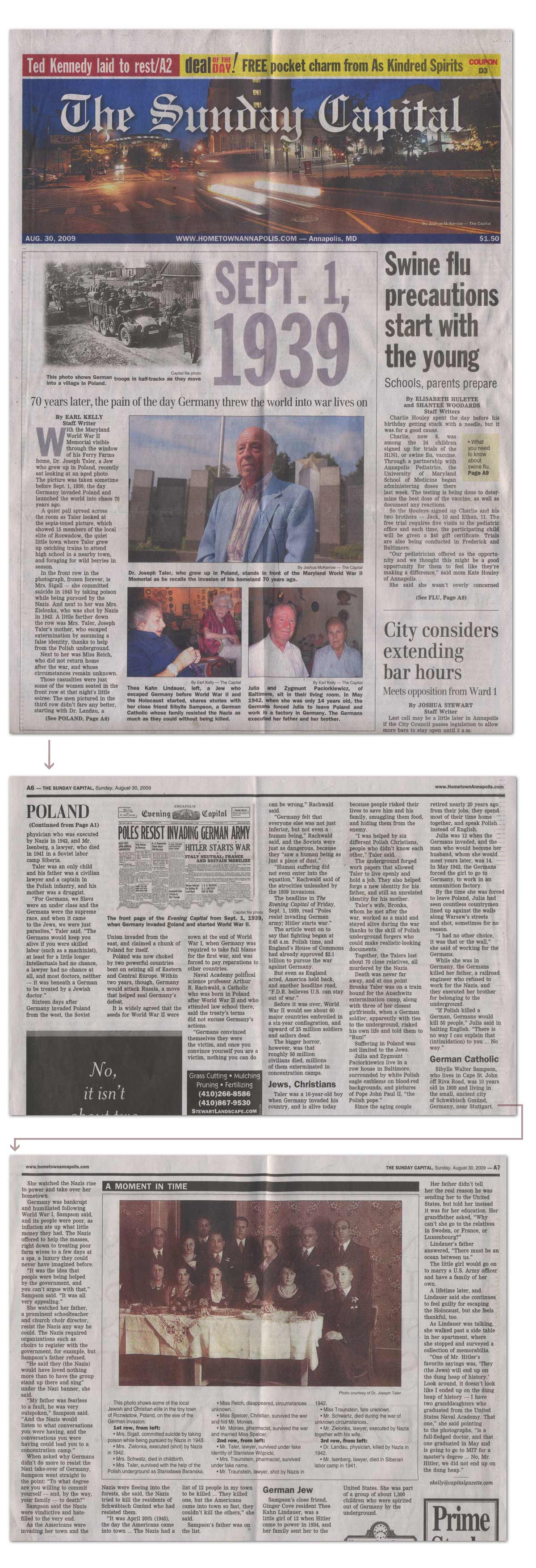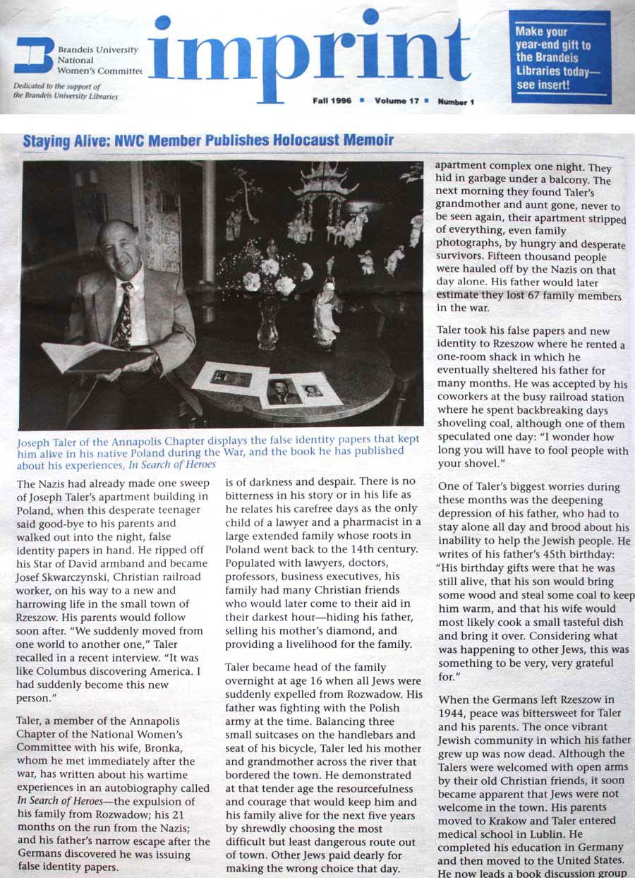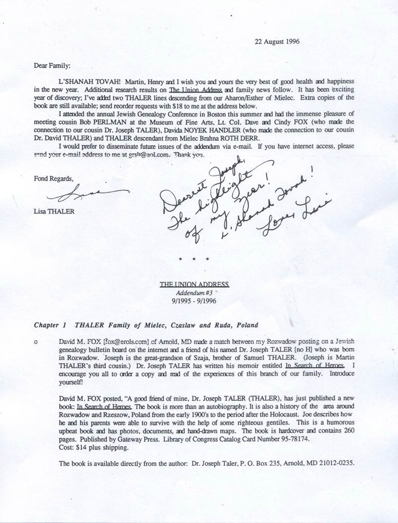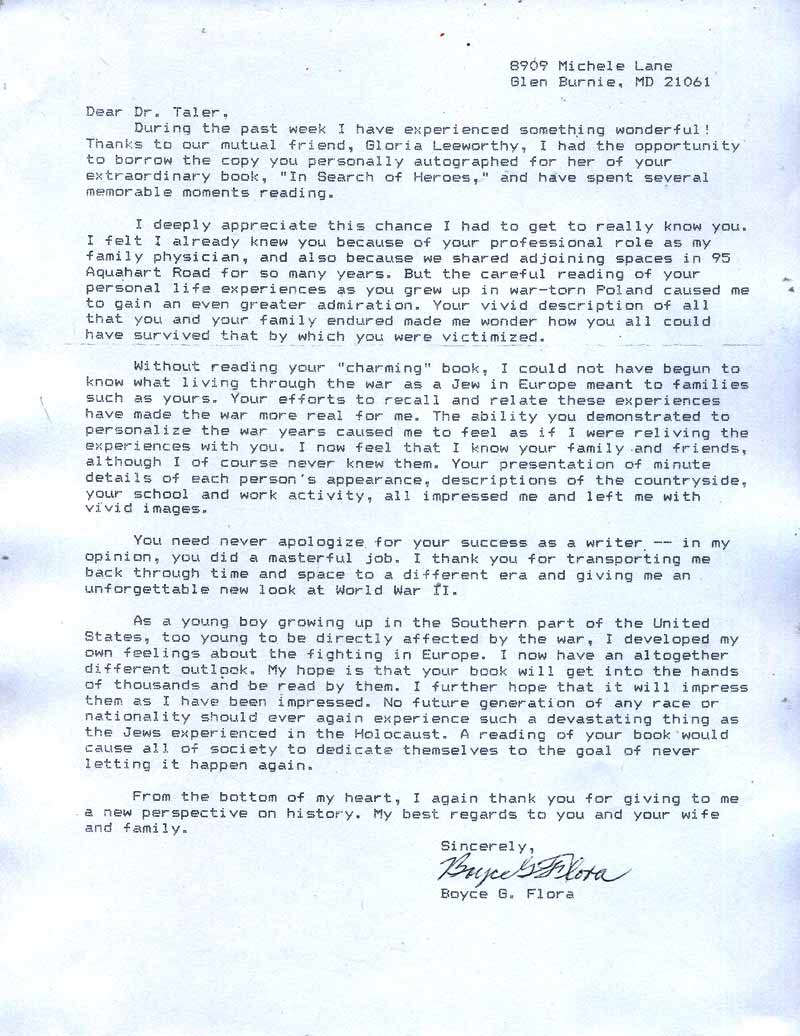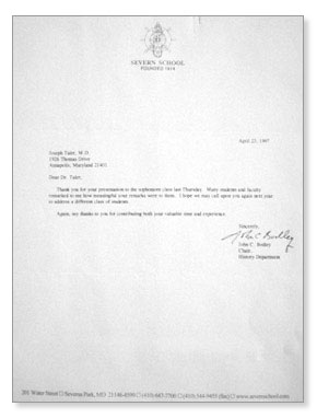 ![]() Four Survivors ... Four Stories Panel Discussion at Temple Beth Shalom October 28, 2009 Early in 2009 Rabbi Ari Goldstein asked me to organize an educational event commemorating the Holocaust. We decided to put it into a broader historical context and to use a prospective panel format. I knew three panelists of different backgrounds and different war experiences. Four of us would respond spontaneously to questions put by Rabbi Goldstein and the members of the audience which included students and people of various occupations and religious interests. About 300 people attended. Arrangements were made by Karen Brachmen, Administrator and Doreen Noel, Office Coordinator. Those who attended expressed many, many thanks for this extraordinary experience. ![]() Rabbi Goldstein's Column click image to enlarge ![]() Rabbi Goldstein's Letter click image to enlarge ![]() click image to enlarge Yom Ha'Shoah Programs in Churches, 1993 ![]() click image to enlarge Thank You Letter Reverend Robert E. Albright Division of Catholic Education Ministries ![]() click image to enlarge Thank you letter John C. Bodly History Deptartment Chair, Severn School ![]() click image to enlarge Thank you letter Janice Jobson The Teacher of Introduction to Human Beliefs, Severn School. Joseph has worked with her since April of 1997. "I have been teaching these classes every year for thirteen years. Introduction to Human Beliefs deals with aspects of life which for the most part are beyond the middle school curriculum." - Joseph ![]() click image to enlarge Thank you letter Janice Jobson The Teacher of Introduction to Human Beliefs, Severn School. Joseph has worked with her since April of 1997. "I have been teaching these classes every year for thirteen years. Introduction to Human Beliefs deals with aspects of life which for the most part are beyond the middle school curriculum." - Joseph ![]() click image above to enlarge Montgomery County Public Schools Evaluation ![]() click image above to enlarge Supervisor Letter Sandra S. Days ![]() click image to enlarge the 2 letters - click "next" to view second letter 2 letters to Dr. Joseph Taler The United States Holocaust Memorial Museum ![]() click image to enlarge Thaler's and Talers Cindy Fox, Lisa Thaler (Genealogist and Author), Lt. Col. David Fox, Martin Thaler (Lisa’s husband and my third cousin) holding their son Henry Thaler David Fox established a link between Joseph and the Thaler Family. Photo taken by Joseph at Joseph and Bronka’s home in Annapolis, 2000 |