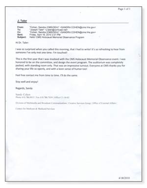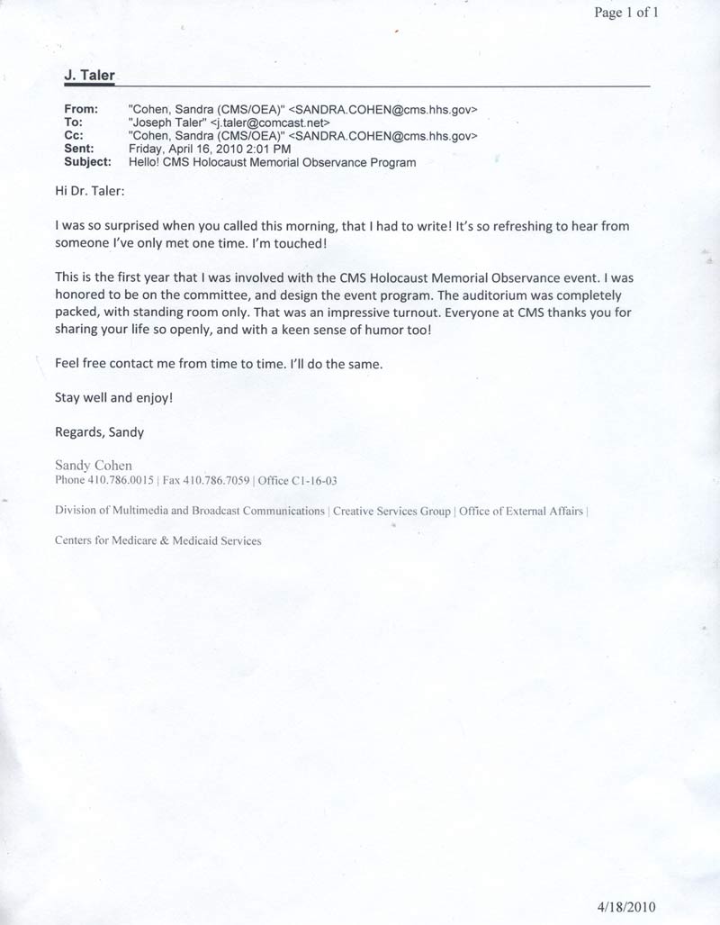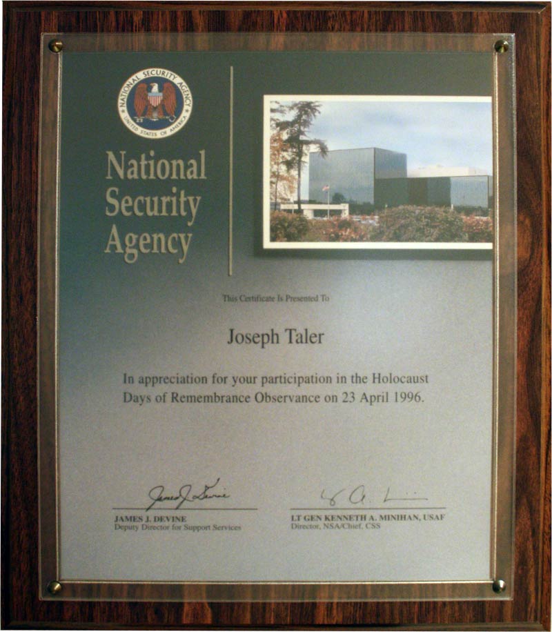 ![]() Panelists: Paul Schatzberg, Leon Cytryn M.D., Maren Friedman, Joseph Taler M.D. click image to enlarge ![]() From Left: Paul Schatzberg, Joseph Taler M.D., Toby Schatzberg (wife of Paul Schatzberg), Maren Friedman, Ilene Cytryn (wife of Leon Cytryn M.D.), Bronka Taler (wife of Joseph Taler M.D.) click image to enlarge ![]() The Panelists click image to enlarge ![]() The Holocaust: Four Unique Perspectives Beiteinu | September 2009 click image to enlarge ![]() Lt. General Kenneth A. Minihan, USAF, Director NSA/Chief, CSS shakes hands with Dr. Joseph Taler and gives him the National Security Agency's Certificate: Participation of Holocaust Days of Remembrance Observance, April 1996 ![]() click image to enlarge and see certificate ![]() Click image to enlarge program ![]() Click image to enlarge Certificate Center for Medicare and Medicaid Services' Holocaust Memorial Observance April 15, 2010 ![]() click image to enlarge Sandy Cohen Center for Medicare and Medicaid Services' Holocaust Memorial Observance ![]() click image to enlarge and read Joseph Taler's sample text Textbook for Teaching Students English Authors: Dorothy Kauffman & Lynda Franco ![]() click image to enlarge Thank you letter Boyce G. Flora Director of Social Security Administration for Anne Arundel County ![]() click image to enlarge Letter from James Walker President & Chief Executive, North Arundel Hospital ![]() click image to enlarge Letter from Dr. Joseph Taler Joseph Taler, Chief of Department of General Practice ![]() click image to enlarge "Introduction to Human Beliefs" Class Severn school, Severna Park Maryland 8th graders and their Teachers 2010. In the background on right is Mrs. Leslie Brannigan, 8th grade Teacher and coordinator of the program. |